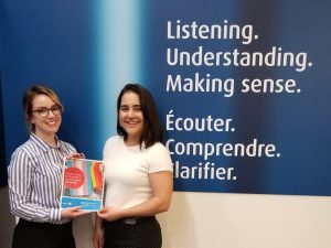 Abbie Sizer McIntosh (L) and Arpita Dar (R) holding the Gender Pronoun Signage displayed in BMO branches across Canada.