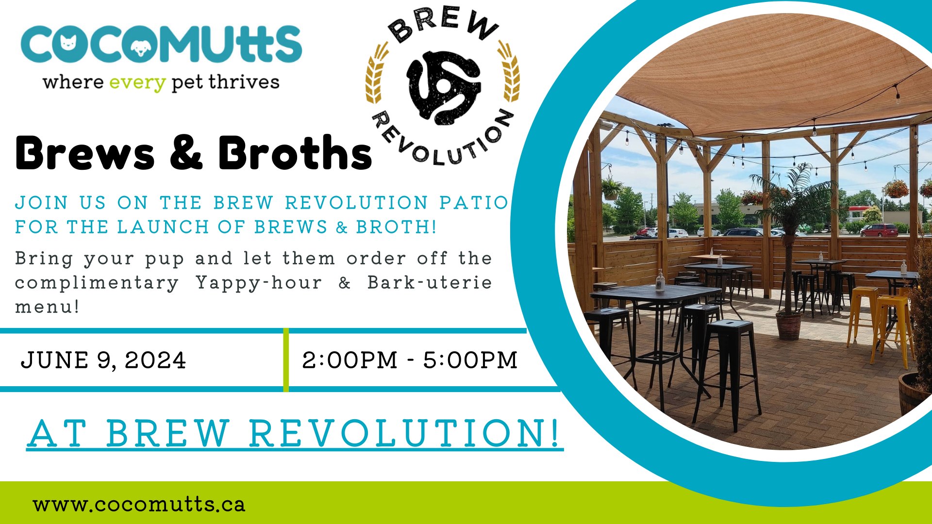 Join the team at Cocomutts for the launch of Brews & Broths! In partnership with Brew Revolution we are so excited to bring you a special menu just for your pup! You can enjoy a flight of beer for you and a custom pup-safe flight for your pup. The menu features a Yappy-hour section (bone broth) and a Bark-uterie (treats) section that will have your pup begging for more! This […]